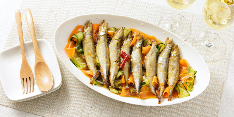 ⑫子持ちししゃもの南蛮漬け ひらひら野菜をそえて