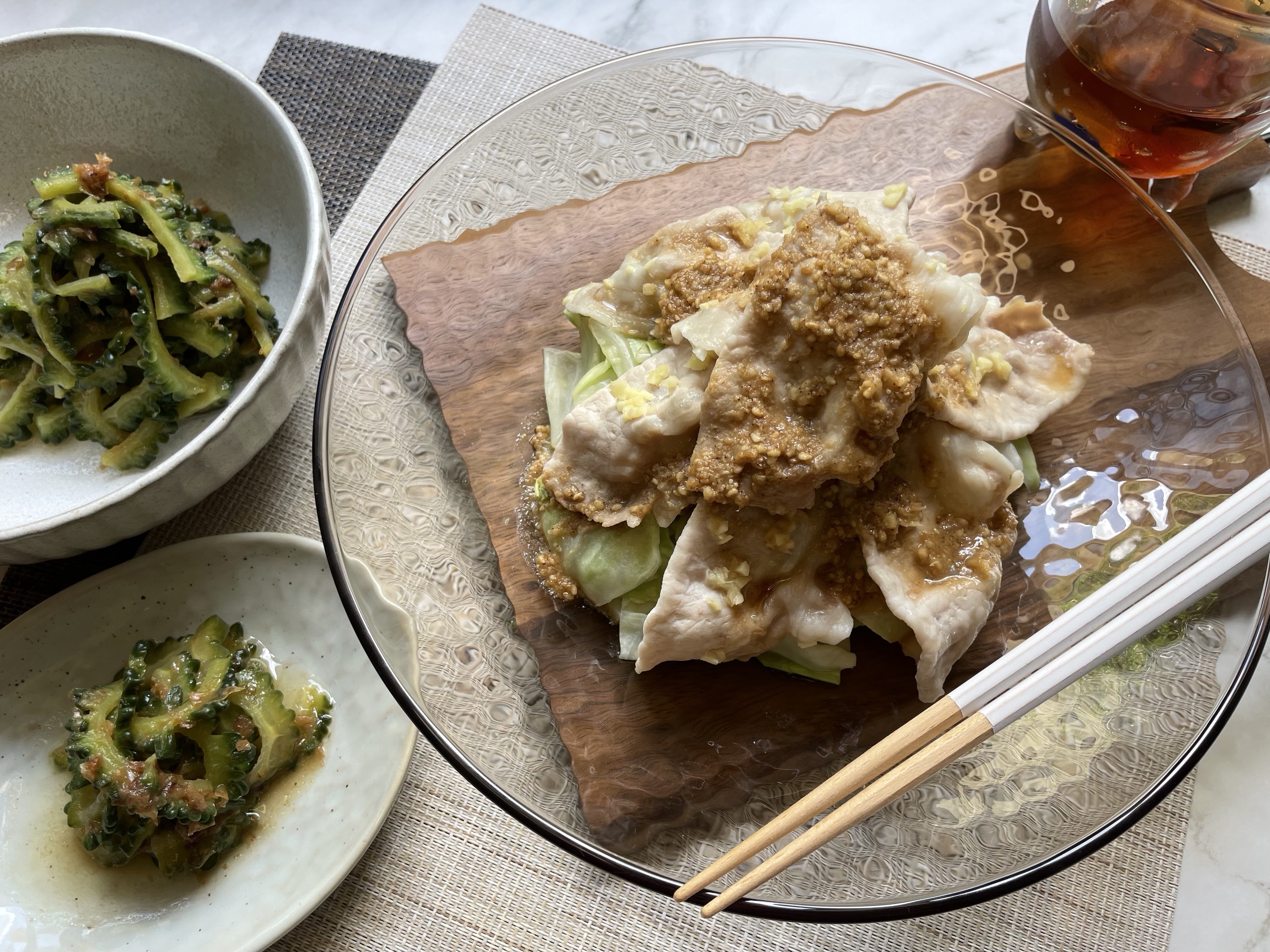 4:しょうがごまポン酢の蒸し豚しゃぶ・ゴーヤの梅おかか和え