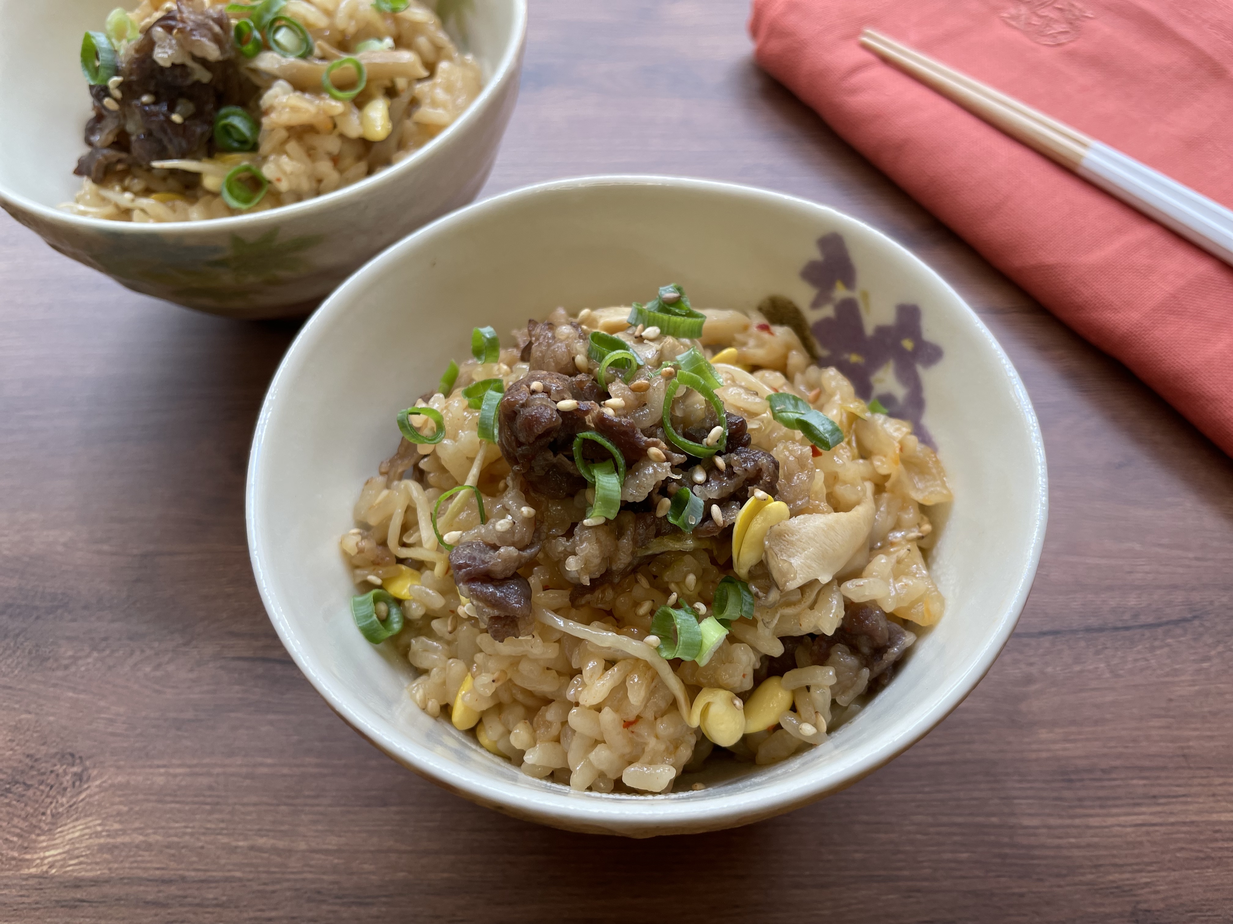 6:大豆もやしと牛肉のキムチ炊き込みごはん