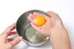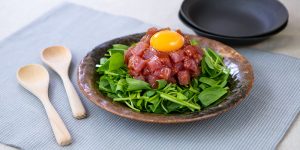 - 器にサラダほうれん草を敷き、マグロをのせる。真ん中を少しへこませておくと、卵黄がのせやすい。たまごは、ボウルなどに割り入れ、盛り上がっている卵黄をすくい取るように持ち上げ、白身がどろんと落ちたら、そのままマグロの上にのせる。