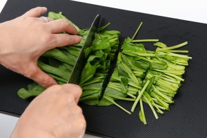 - サラダほうれん草は、よく洗い、水気を拭いて、3から4センチの長さに切る。マグロは一口大の大きさに切る。