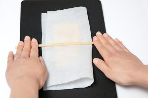 - 油揚げはクッキングペーパーで挟んで、上から手で押す。または菜箸で転がす。(こうすることで、余分な油分を取り除き、袋状に開けやすくなる)