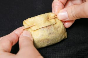 - ビニール袋の中で具を4等分にし、袋の角を2センチ程度ハサミで切り落とす。袋状に開いた油揚げの中に、袋の角を差し込み絞り出すように、それぞれ具を詰める。合計4つ詰めたら、油揚げは左右の角を内側に折ってからもう一度手前に折り、つまようじで縫うように留める。