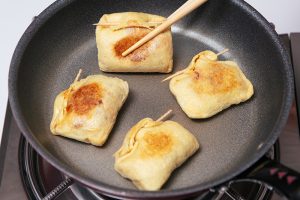 - 中火で温めたフライパンに並べ入れて焼く。弱火で2分焼き、裏返してさらに2分、表面がかりっとするまで焼く。