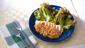 - 器にサニーレタス・サラダチキンを盛り付け、合わせ調味料をかけて、出来上がり。