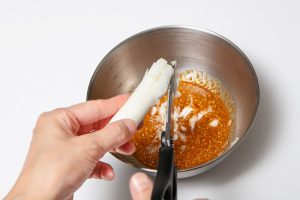 - 白ネギは、ハサミでみじん切りにする。切り口が十文字になるように縦に長く切ってから、切り口から斜めに鉛筆を削るイメージで、細かく刻んでいく。