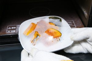 - 冷凍かぼちゃは、耐熱皿に重ならないように並べ、電子レンジ500ワットで5分程度加熱し、粗熱をとっておく。レンジから取り出す際は、やけどに注意する。
