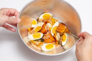 - 大きめのボウルに、酢・にんにくすりおろし・トマトケチャップ・マヨネーズ・塩・黒こしょうを入れ、水気をきったツナ缶を入れ、よく混ぜておく。混ぜあわせた手作りドレッシングに、粗熱を取ったかぼちゃ・茹でたまごを入れ、ざっくり混ぜる。
