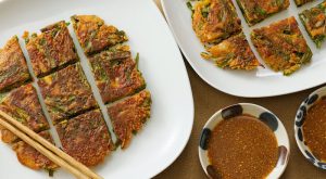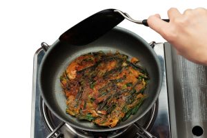 - チヂミの周りが固まって、パチパチ音がするまで3分ほど焼いて、裏返す。さらに2分カリっとするまで焼いたら取り出す。残りのタネも同じように焼く。