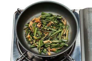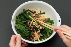 - ニラは、根元を切り落とし、4センチの長さに切る。
