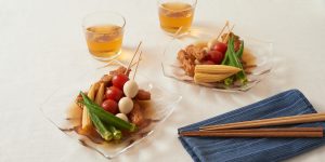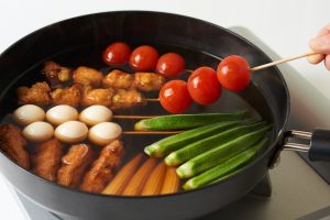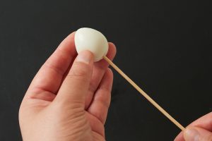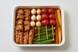 - うずらのたまご・さつま揚げ・プチトマトは、1人分ずつ竹串に刺しておく。刺す際は、具材をしっかりつかみ、具材の中心に串が刺さるようまっすぐ平行になるように刺すと良い。刺しにくいときは、竹串を回すように刺し、最後の1個は深めに刺すと抜けにくくなる。