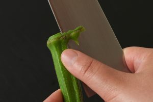 - オクラは、ヘタの先端を切り落とし、ガクの周りの固い部分をぐるりと一周むいておく。