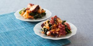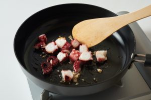 - 水気を切ったタコを入れ、手早くからめる。加熱が長いとタコがかたくなるため、余熱でにんにく・ごま油とからめるようにする。