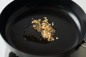 - フライパンにごま油とにんにくを入れ、弱火で2分ほど香りが出るまで加熱し、火を止める。