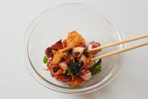 - ボウルに戻したわかめ・鶏がらスープの素を入れ、タコを加えよく混ぜる。キムチを入れ、ざっくり混ぜる。