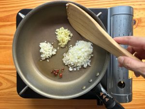 - 小さめのフライパンに、ごま油を入れ、赤唐辛子輪切り・刻んだにんにく・しょうが・長ネギを入れ、中火にかける。パチパチと音がしてきたら、弱火にして5から7分ほど、よい香りがするまで炒める。