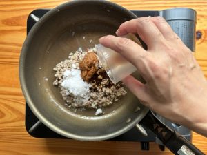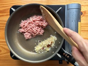 - フライパンの中身を木べらで手前に集め、中火にして、奥のスペースに豚ひき肉を入れ、ぽろぽろになるまで5分ほど炒める。
