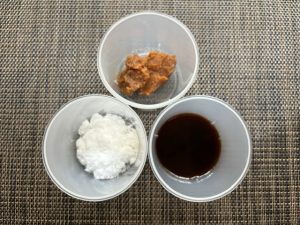 - 納豆入り肉みその調味料を準備しておく。砂糖・合わせみそ・オイスターソースは、1:1:1。