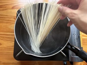 - 片手鍋で湯を沸かし、そうめんを好みの固さに茹でる。(パッケージを参照する)茹で終わったら、ざるにあけ、冷水で何度かすすぎ粗熱を取り、水気をきっておく。