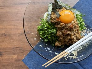 - 小粒納豆は、付属のタレを入れ、混ぜ合わせる。火を止めたフライパンの中に入れ、ざっくりと混ぜ合わせておく。これで、納豆入り肉みそは完成。