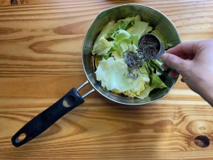 - 鍋に水を入れ、キャベツ・めんつゆ・塩昆布を入れて、中火で3分加熱する。