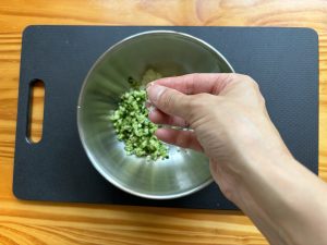 - 玉ねぎときゅうりはみじん切りにして、塩を入れて混ぜておく。