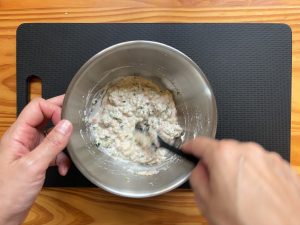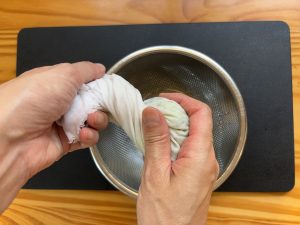 - 5分ほどおくと水気が出てくるので、さっと洗ってさらしなどで包み、水気をしっかり絞っておく。その後、塩・黒こしょうで下味を付けておく。