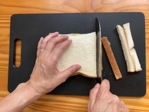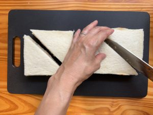 - 挟んだら、軽く上から押してなじませ、2等分に切り分ける。