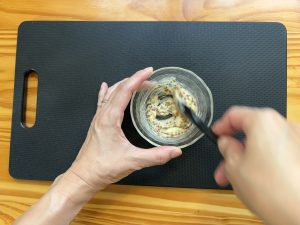 - バターは耐熱の小皿に入れ、電子レンジ500ワットで10秒から15秒ほど加熱し、少し溶かす。粒マスタードを入れ、よく混ぜ合わせておく。