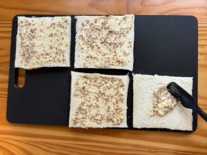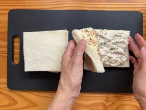 - 具を乗せていないパンを、マスタードバターを塗ってある面を下にして、挟む。2組のサンドイッチができる。