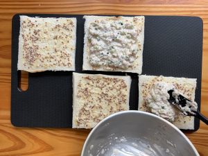 - ボウルの中を2等分に分け、パン2枚の上に均等に乗せ、広げておく。