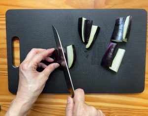 - なすは、よく洗い、固いヘタの部分を2センチほど切り落とす。長さを2等分にしてから、縦に4から6等分にする。