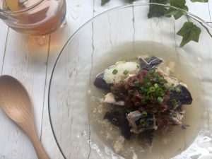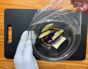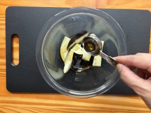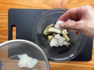 - 耐熱ボウルにナスを入れ、塩・ごま油を回しかける。