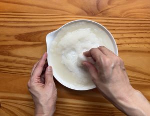 - 軽くラップをして、電子レンジ600ワットで、約1分30秒加熱する。取り出す際は、やけどに気を付けて、軽く混ぜておく。