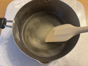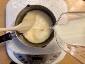 - 牛乳は計量してから室温に戻しておく。小さめの鍋と、流し箱(12センチ×7.5センチ×4.5センチ)や、プリンカップなどを準備しておく。