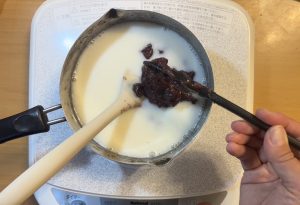 - 砂糖を入れ、弱火のままゆっくりと全体を混ぜる。常温の牛乳を入れ、30秒から1分、鍋底や鍋肌などもむらなく混ぜて、火を止める。