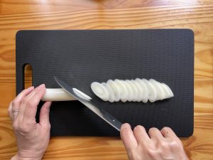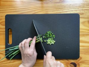 - 万能ネギは、端から小口切りにする。