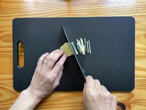 - しょうがは、皮をむいてから千切りにする。