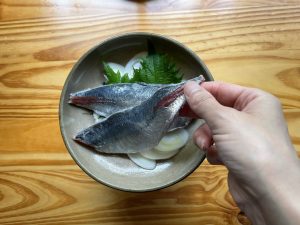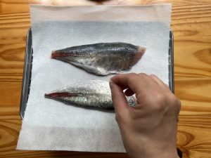 - あじは、余計な水気を拭き取り、塩を振りかけておく。