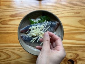 - 合わせておいた調味料を振りかけ、しょうがを散らす。