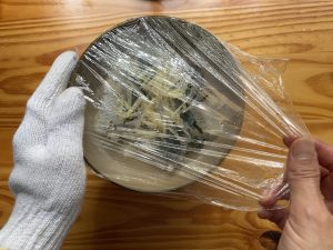 - ふんわりとラップをかけて、電子レンジ50ワットで3分加熱する。取り出す際は、やけどに注意する。