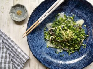 - 深さのある耐熱皿に、ネギ・大葉・あじを順番に乗せる。