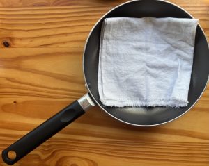 小さめのフライパンに分量外の水約300ccを入れ、さらしをたたんで入れておく。