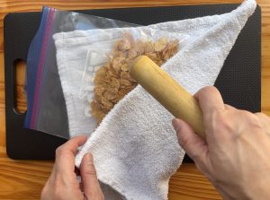 コーンフレークは丈夫なジッパー付き袋に入れ、清潔なタオルで包み、すりこ木などで細かくたたく。