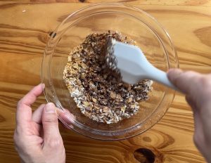 チョコレートが完全に溶けたら、砕いたコーンフレーク・パン粉・塩を入れる。ゴムベラを使い、切るように手早く混ぜる。ボウルのふちにつくことがあるので、内側もしっかり混ぜる。