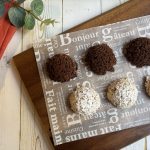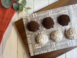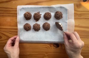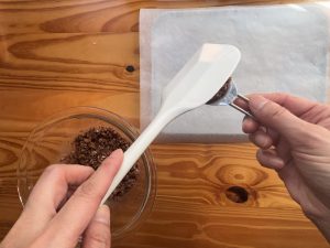 大さじの計量スプーンの内側にサラダ油を少々塗り、ボウルの中身をしっかりとすくい、ゴムベラで上から押し付けてから、クッキングシートにひっくり返す。