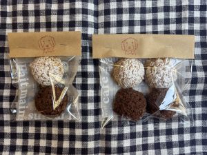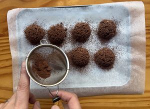 固まった黒クランチにはココアパウダーを、白クランチには粉糖を、茶こしなどで上からふるう。