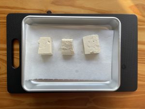 - 木綿豆腐は、軽く3から4等分に手で割りほぐし、クッキングペーパーを敷いた皿の上で30分ほど置いて、水切りをする。