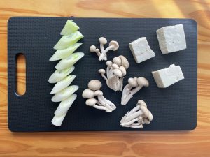 - 長ネギは、斜め1センチに切る。しめじは、石づきを切り落とし小房に分ける。