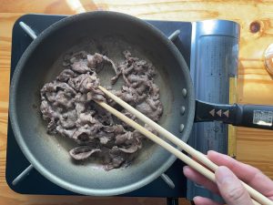 - 小さなフライパンに、ごま油を入れ中火で熱して、牛肉を中火で3分炒める。